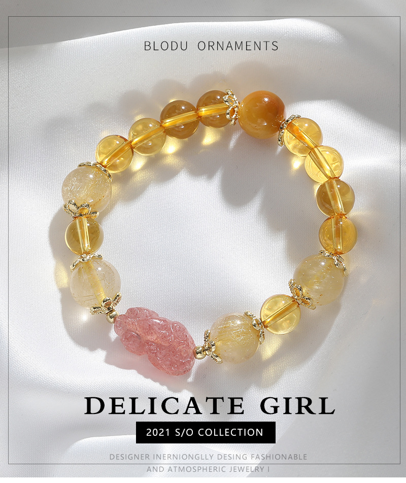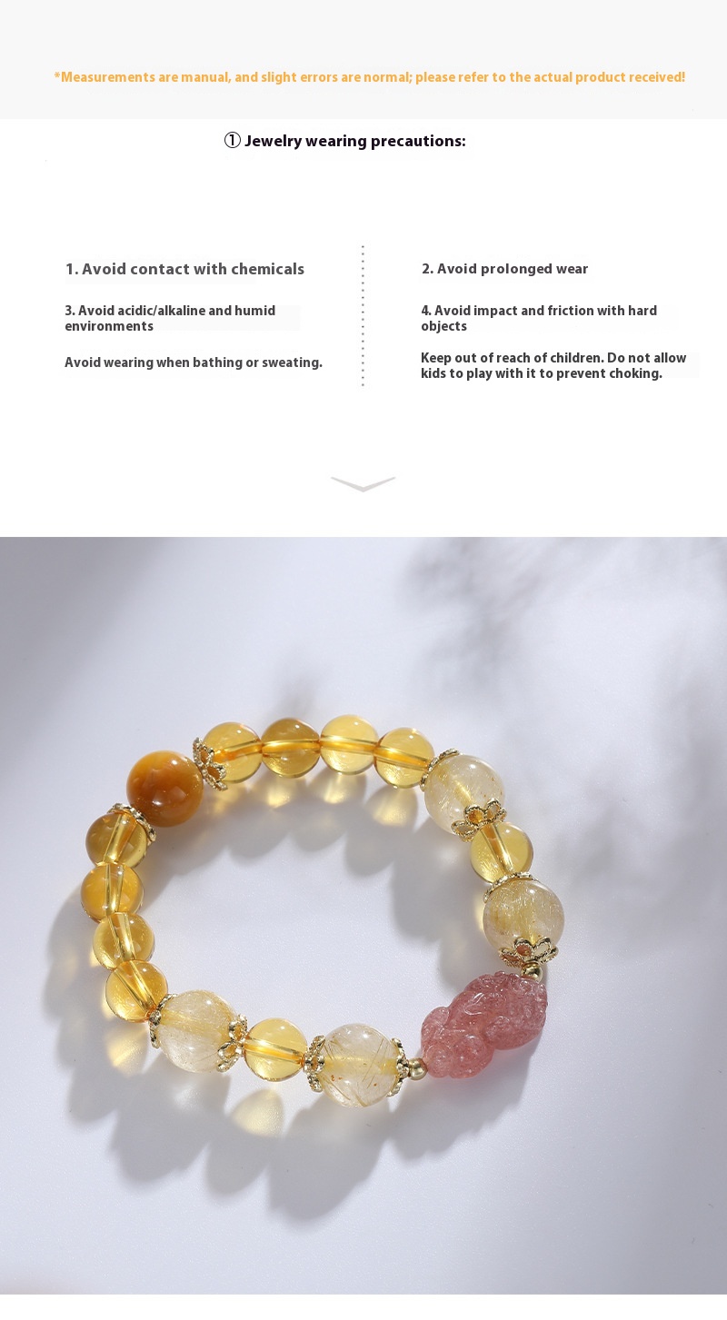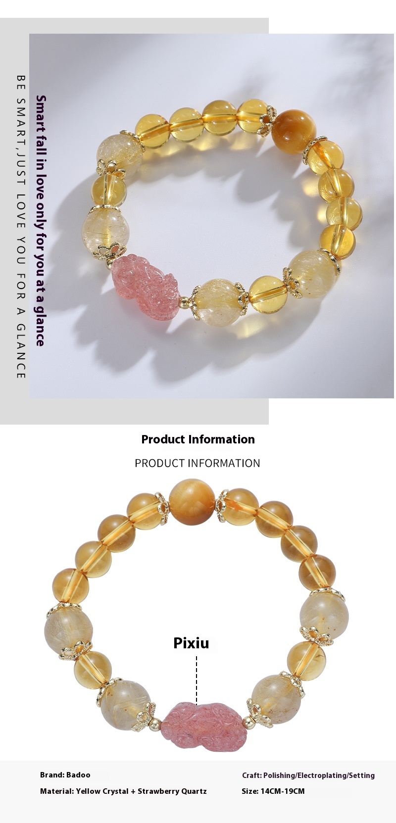 Crystal Synergy, Amplified Energy: Our bracelet is an exquisite combination of natural gemstones including Citrine, Golden Rutilated Quartz, and Strawberry Quartz Pixiu. Each crystal carries its unique energy, and when worn together, they form a comprehensive energy bracelet that embodies prosperity, fortune, protection, and affection.