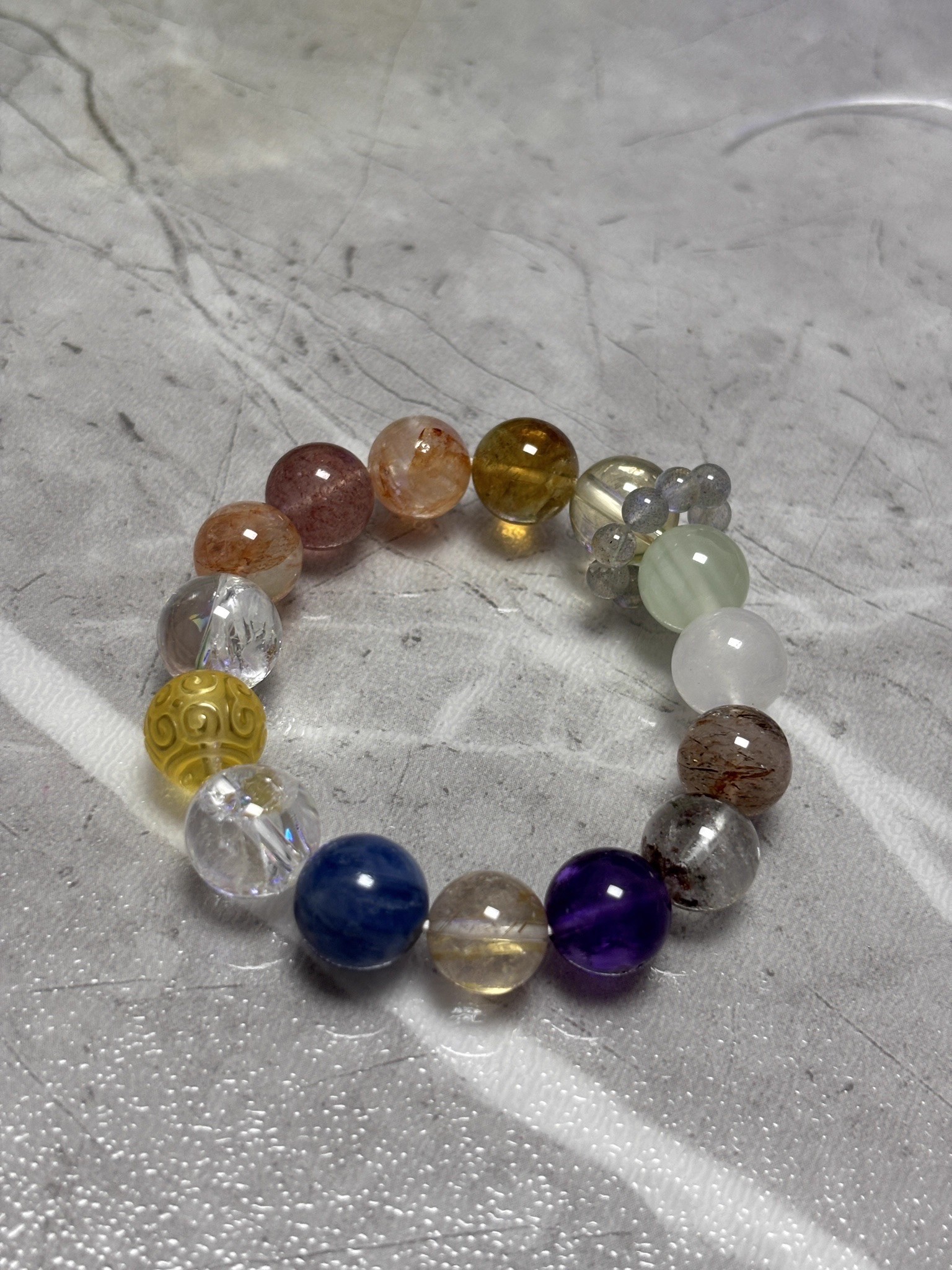 The bracelet combines varied gemstones with diverse colors and characteristics, offering comprehensive support and protection to the wearer. Wearing this bracelet can help one experience increased tranquility, harmony, and happiness while unlocking inner potential and strength, aiding personal growth and development. Whether the goal is wisdom and spirituality, creativity and inspiration, communication and understanding, or wealth and success, health and vitality, love and compassion—this bracelet provides the wearer with directed energy support. More than a beautiful ornament, it serves as a spiritual anchor and a source of strength, accompanying the wearer on life's journey toward personal happiness and fulfillment.