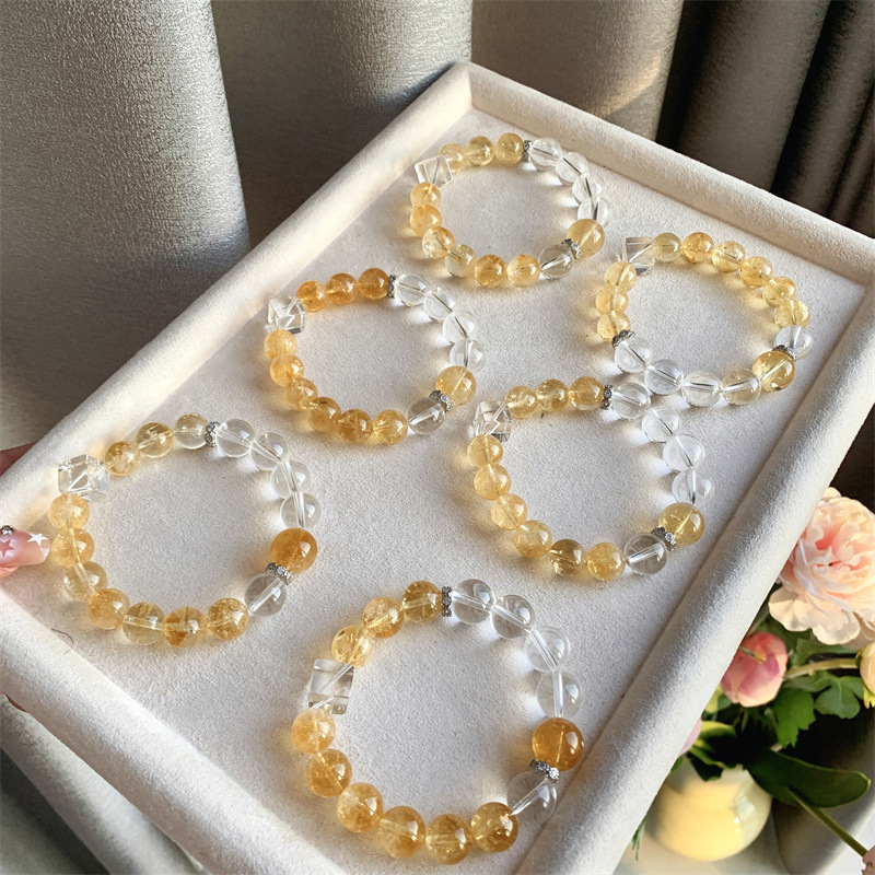 Introducing the Positive Energy Attraction Bracelet, an elegant piece crafted from premium citrine and clear quartz crystals. Each bead is meticulously selected for its transparency and natural glow, providing a comfortable wearing experience. The combination of golden citrine and clear quartz creates a sophisticated yet refreshing aesthetic, suitable for everyday wear, professional attire, or significant occasions, showcasing your distinctive taste. Enhanced with silver spacer beads and accented by a cube of white quartz, this bracelet exudes meticulous craftsmanship and attention to detail.