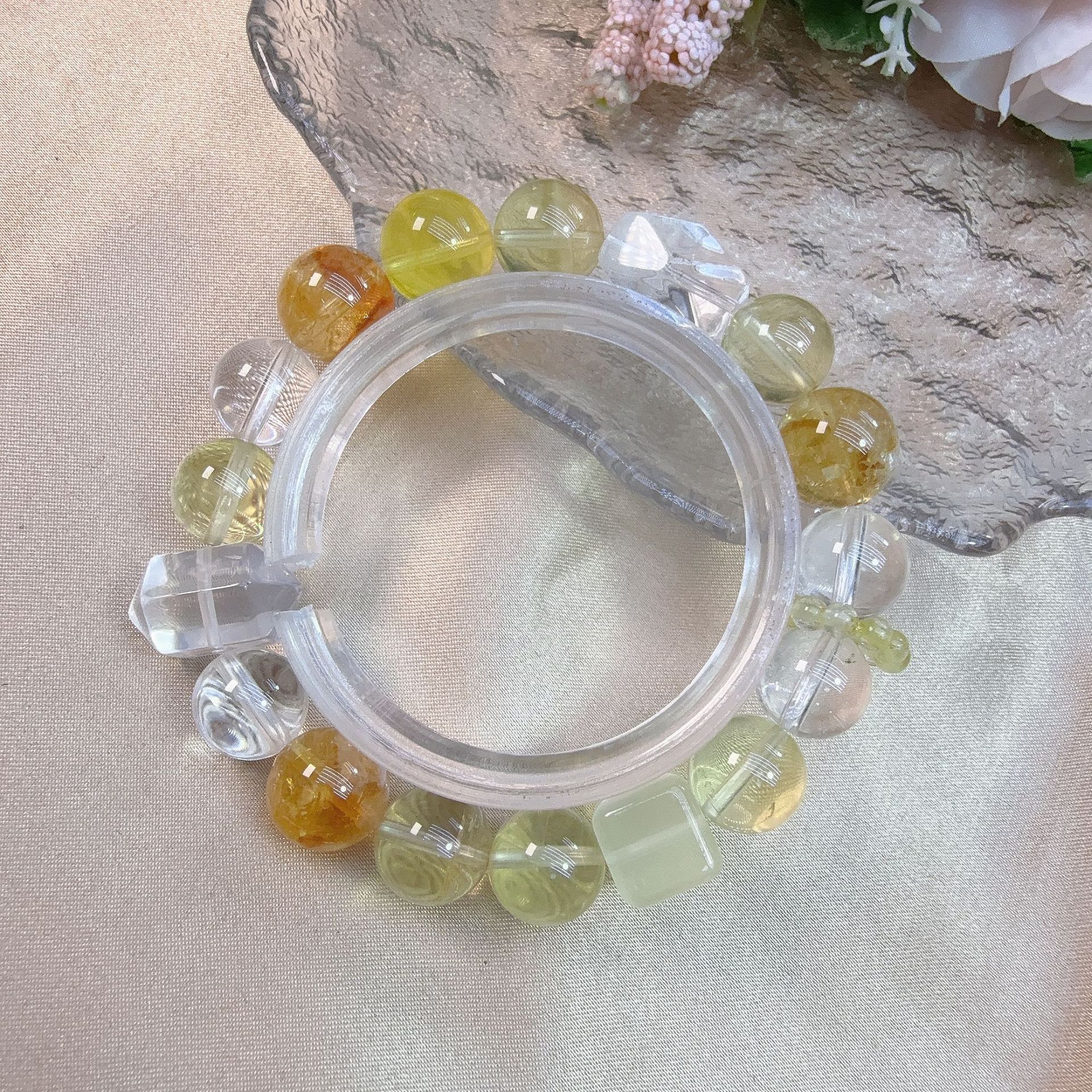 The bracelet combines natural crystal beads with geometrically cut stones. The round beads feel smooth and warm, while the faceted stones add structure and shimmer. Each crystal displays unique textures and brilliance, offering a lively play of light. The high-clarity crystals provide a visually soothing effect, and their bright hues are reminiscent of a sunny spring morning, enhancing both elegance and mood.
